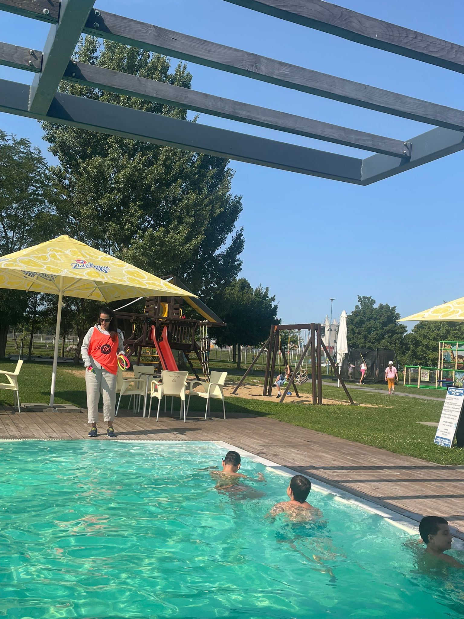 Bláznenie v bazéne so slanou vodou, lehárko na pláži.